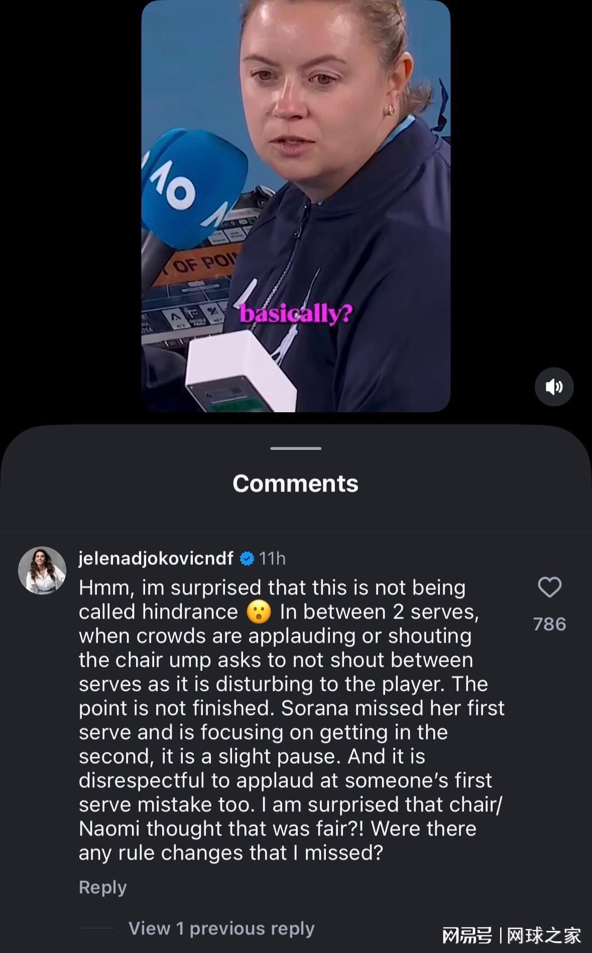 “嗯,我很惊讶这居然没有被判为妨碍比赛。在两次发球之间,如果观众鼓掌或喊叫,主裁判都会要求他们安静,因为这会干扰球员。此时这一分并没有结束。索拉娜刚刚一发失误,正专注于把二发发进场,这是一个短暂的停顿。而且,在别人一发失误后鼓掌本身也是不尊重的。我很惊讶主裁/大坂会觉得这很公平?!是不是我错过了什么规则的改动?”